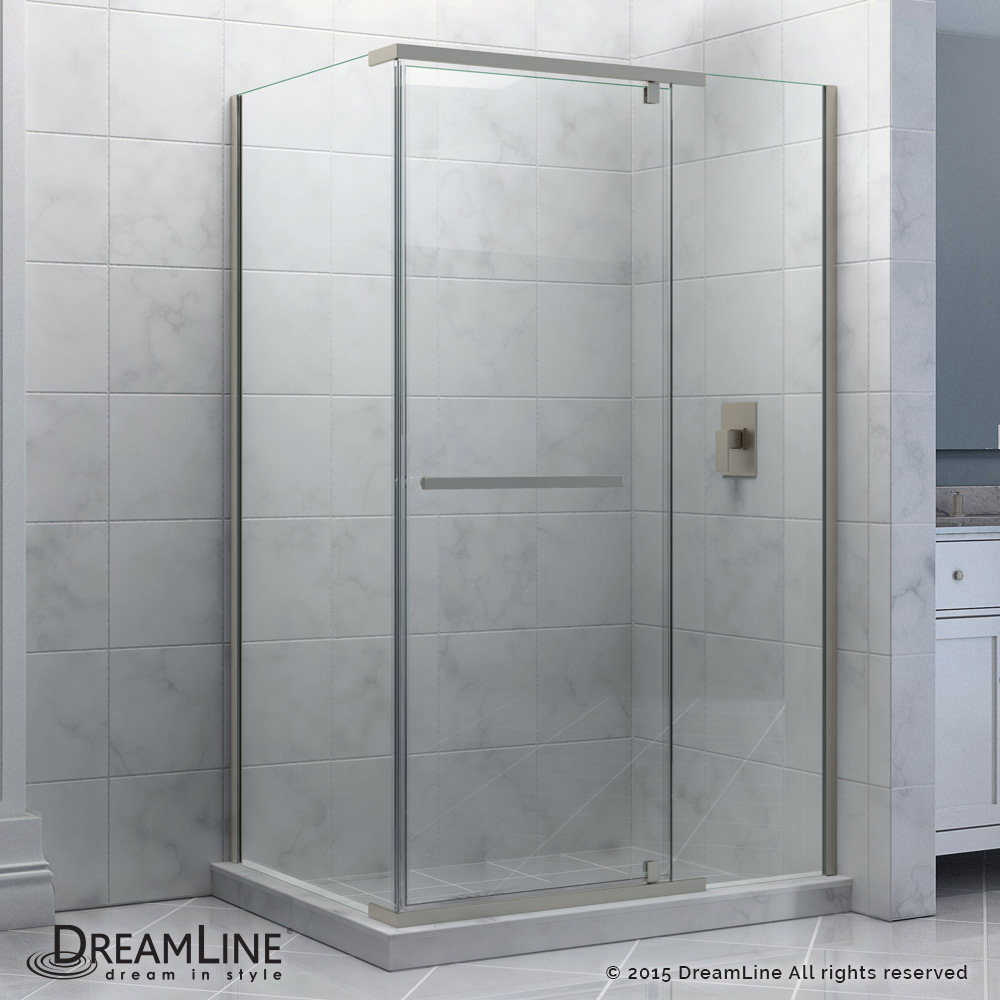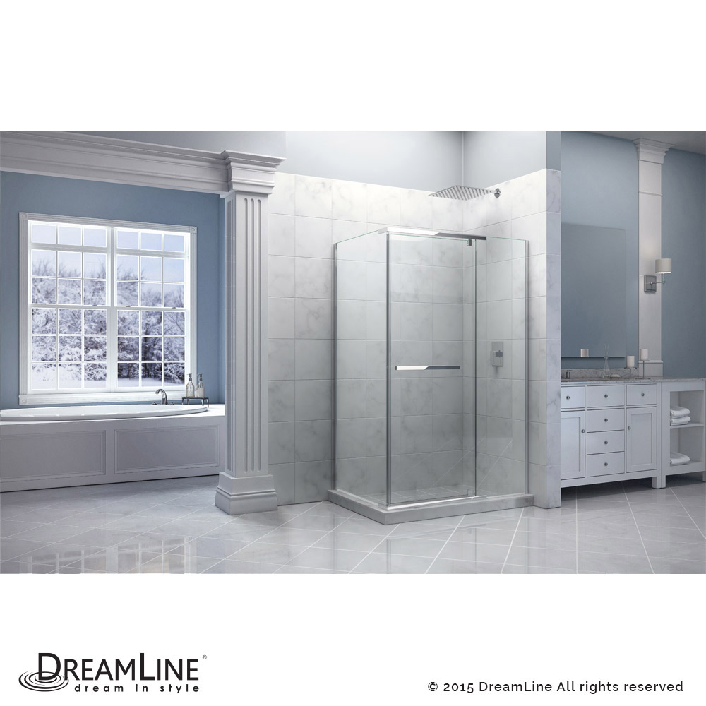 The Quatra shower enclosure offers a flowing frameless glass design for a sleek and modern look. The sophisticated pivot hardware delivers an effortless operation, while upper and lower stainless steel brackets prevent water leaks and secure the structure. Install the Quatra on a custom tiled floor or an optional DreamLine acrylic shower base to dramatically transform your bathroom.